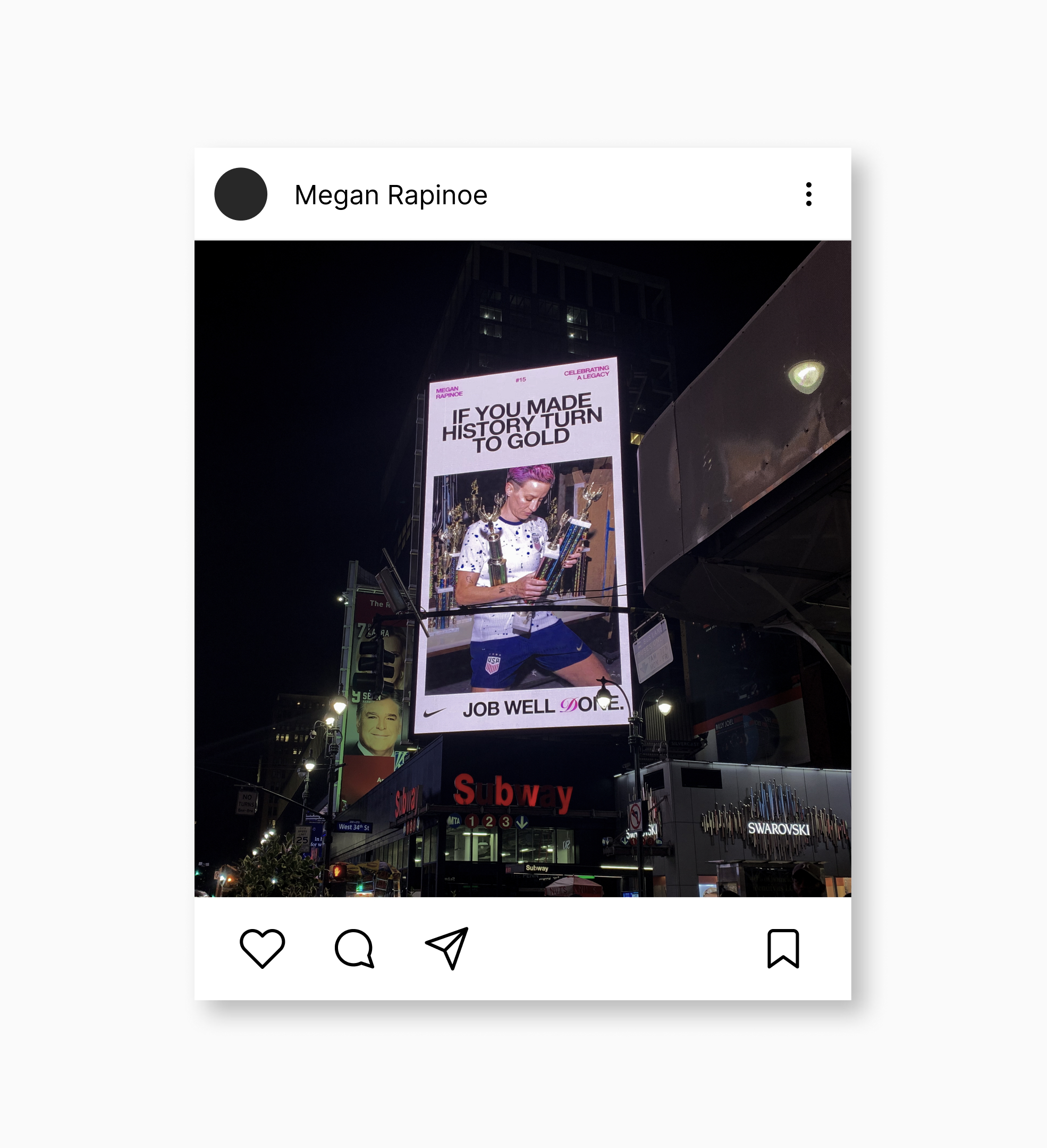 The work came to life across high-visibility DOOH placements in Los Angeles and New York, supported by social and print content timed to her final home game with OL Reign. In collaboration with the team at TOGETHER, one of our art directors and our lead animator contributed to the campaign’s visual execution across all touch points. This included bespoke motion design for digital billboards at Circa LA and Nike’s W 34th Street location in NYC, as well as animated assets for Nike’s Instagram carousel and supporting event materials.